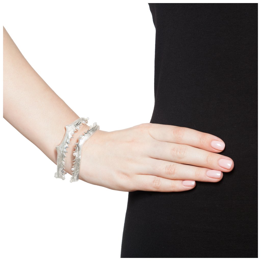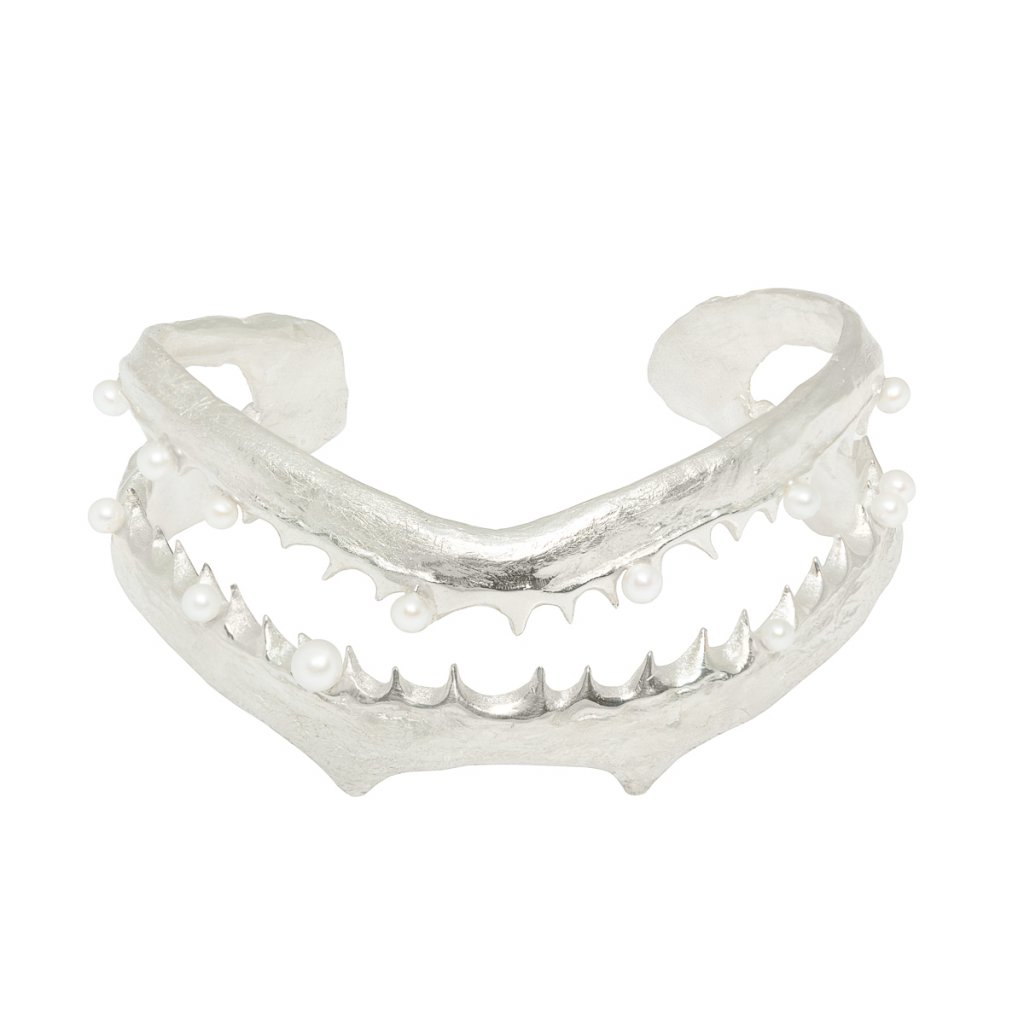 A bracelet inspired by the jaw of a great white shark decorated with several sweet water pearls.