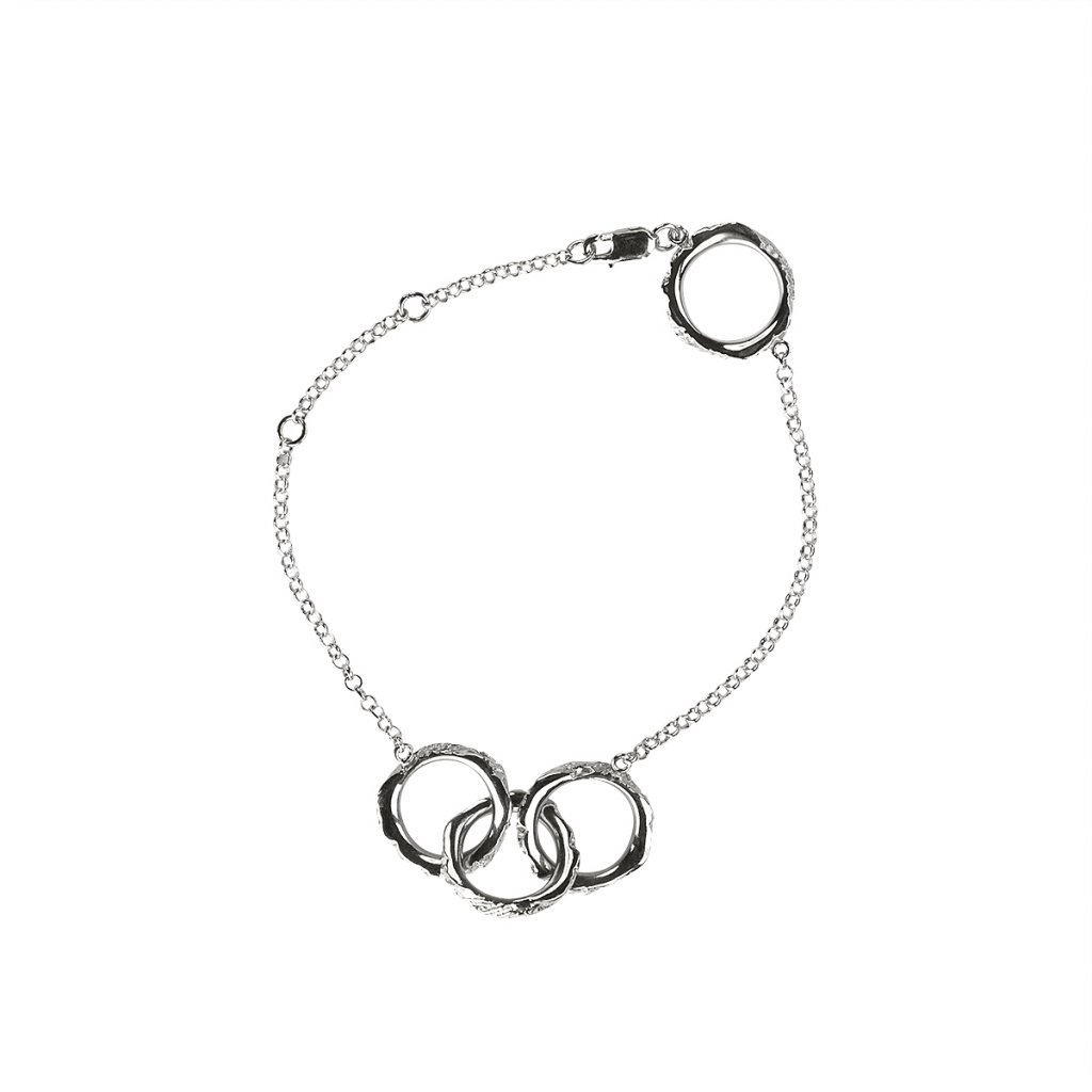 Tento náramek je součástí naší FOAM kolekce. Náramek má hrubší texturu a díky jeho třem kroužkům zapínání je možné jeho délku i upravit. Náramek je tvořen z jemného řetízku doplněný třemi většími kroužky.