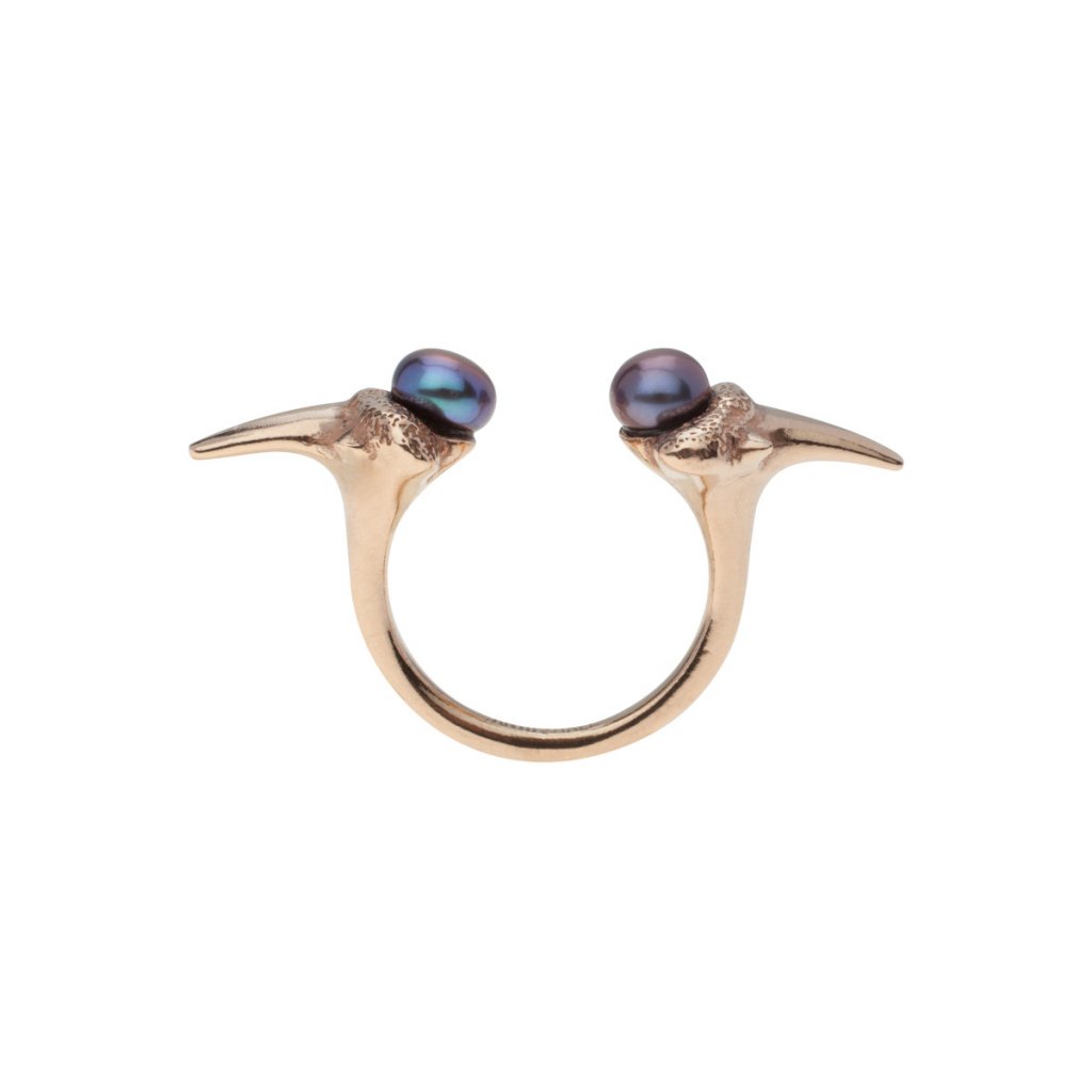 Tento prsten je součástí JAWS kolekce. Jedná se o otevřený prsten inspirovaný žraločími zuby a doplněný dvěmi perlami.